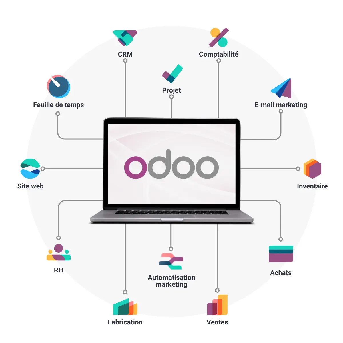 Odoo est un ERP complet et modulable qui permet de centraliser toutes les activités de l’entreprise dans un seul outil.